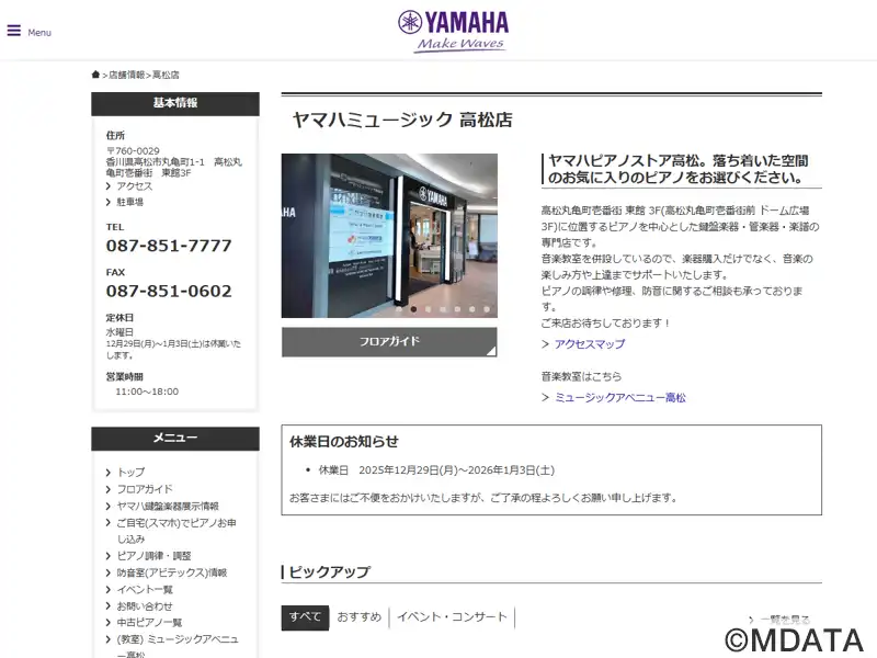 高松市のショッピングモール、丸亀町壱番街東館3階にある総合楽器店。2019年7月に、丸亀町商店街から現在地に移転オープン。ピアノを中心とした鍵盤楽器、管楽器、楽譜の展示販売をする。また、主要ホールで活躍する調律技術者によるピアノの調律や修理、防音設備を提供する。音楽教室「ミュージックアヴェニュー高松」を運営し、子ども向けの「ヤマハ音楽教室・英語教室」と大人向けの「ヤマハミュージックレッスン」を提供する。