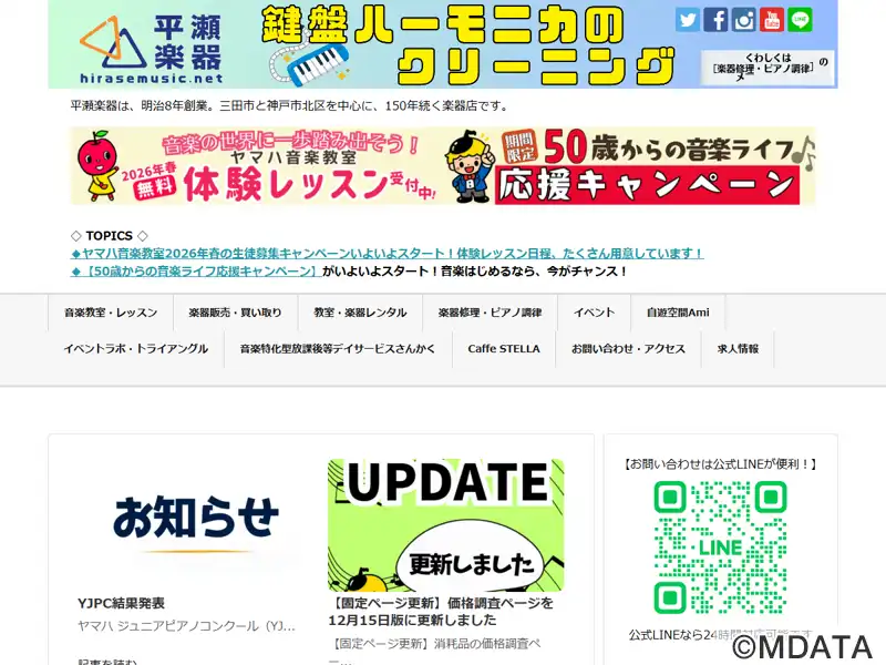 兵庫県三田市の中央町商店街にある楽器店&音楽教室。1Fショップでは、ギターやウクレレ、弦やリード、楽譜、音楽グッズなどを販売しており、音楽の盛んな街・三田市で、はじめの一歩を踏み出すためのサポートを提供する。ピアノ調律や修理も対応。2Fは10部屋の教室で、平瀬楽器オリジナルの個人レッスン、ヤマハ音楽教室・英語教室、ヤマハミュージックレッスンを開講。音楽を通じたコミュニケーションを大切にしている。