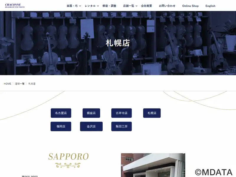 オリジナルの新作CHACONNE、新作イタリー、オールド・モダンの名器・楽弓など豊富に取り揃え、ヴァイオリン、ヴィオラ、チェロの弦楽器専門店「シャコンヌ」札幌支店として1996年オープン。弦・小物・輸入楽譜は郵送も可。修理・調整では、より良い音を日々追究し、独自の技術により楽器を最高の状態に仕上げます。コンサート本番前の最終メンテや弓の毛替えも承っています。地下鉄さっぽろ駅21番出口すぐ。