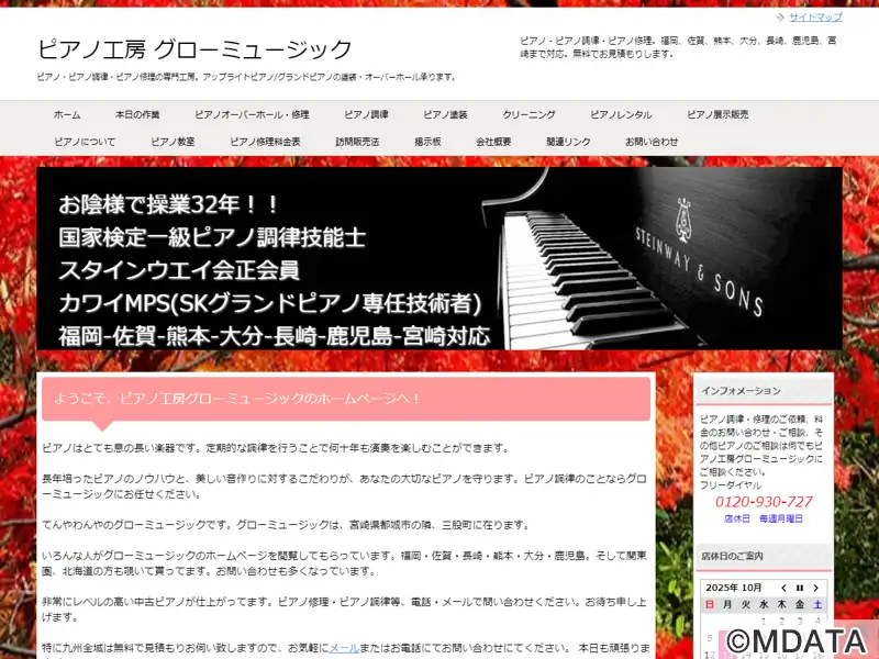 宮崎県三股町にある、ピアノの調律・修理・塗装を専門とするピアノ工房。スタインウェイをはじめ、国内外の様々なメーカーのピアノや、大正期のピアノ・オルガンのオーバーホールを手掛ける。国家検定一級ピアノ調律技能士の資格を持つスタッフにより、丁寧な修理・調整が行われる。また、グローミュージック学院としてピアノ・ドラム・絶対音感プログラム(幼児科)の教室も開講。音楽の基礎から応用まで幅広く学ぶことができる。