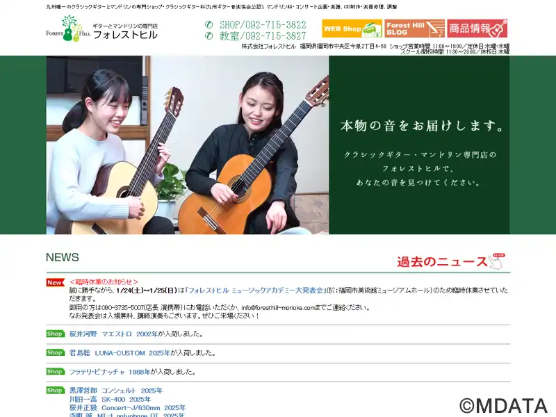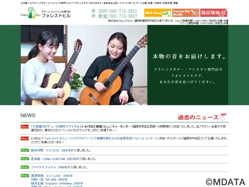 福岡市にある、1986年創業のクラシックギターとマンドリンの専門店。日本や世界の銘工のギターやマンドリンの在庫を保有。楽譜、CD、小物の販売も行っている。音楽教室の「フォレストヒルミュージックアカデミー」では、初心者からプロ志望者までを対象に、クラシックギターとマンドリンの個人レッスンを行っている。専門家(プロ養成コース)、海外留学希望の相談にも応じる。国内外の演奏家のコンサート・講習会も主催する。