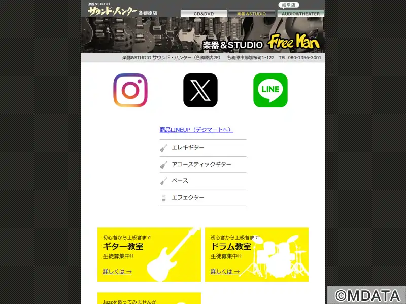 岐阜県にある音楽ショップ「サウンドハンター」2階にある楽器店&スタジオ。豊富なギターの品揃えは、エントリーモデルからハイエンド、中古品まで幅広く、アンプ、エフェクター、小物類も充実。リペアブースでのギターメンテも対応可能。また、20畳のAスタジオと14畳のBスタジオが併設され、練習や音楽制作に最適な環境も提供している。初心者から上級者まで楽しめるギター、ドラム、ジャズ・ボーカル教室も開講している。