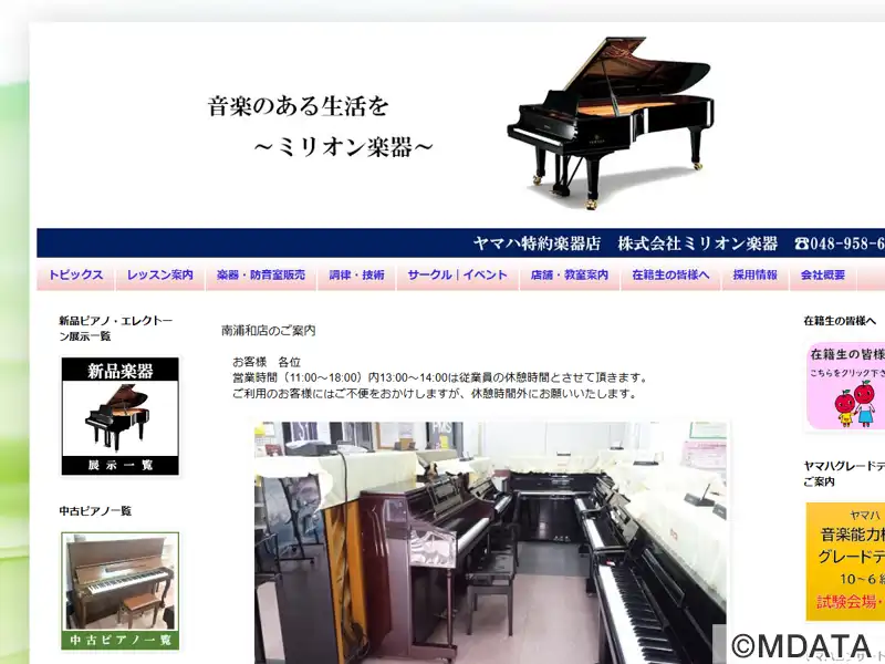 さいたま市のJR南浦和駅東口から徒歩3分の場所にある楽器店。中古のアップライトピアノを中心に、新品ピアノや電子ピアノのクラビノーバ、防音室アビテックスなどを展示している。専門スタッフが環境や予算に応じて、新品と中古を組み合わせた提案を行う。楽譜や音楽小物も取り扱うほか、防音室のスタジオレンタル、調律・修理など技術サービスにも対応。全12室のレッスン室を備え、ヤマハ音楽教室・南浦和センターを併設する。