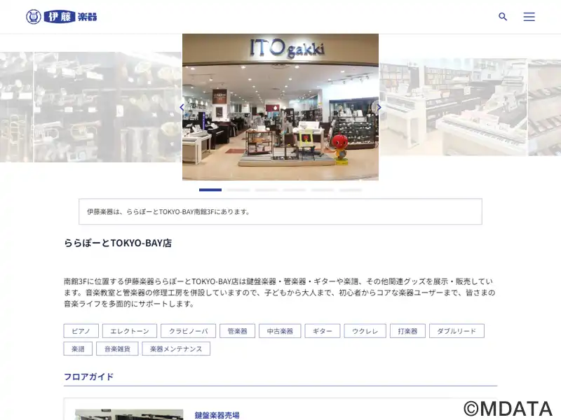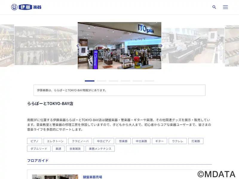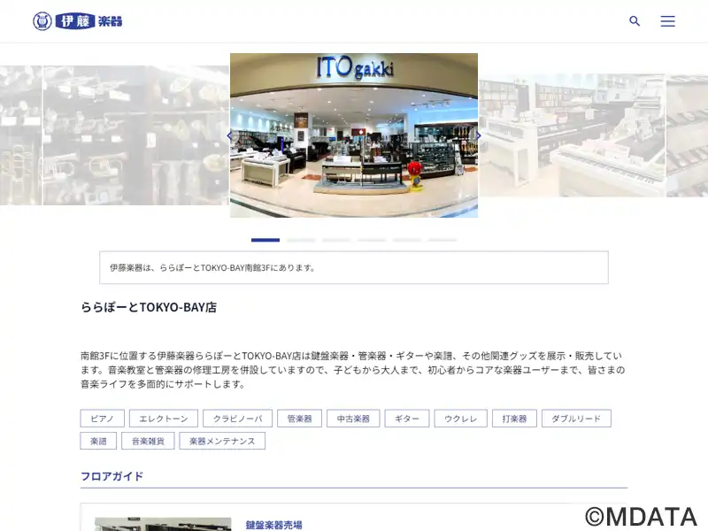 千葉県船橋市のショッピングモール、ららぽーとTOKYO-BAY南館3Fに位置する総合楽器店。管楽器と鍵盤のショップとして、新品・中古のピアノや電子ピアノの常時展示と、簡単なメンテナンスや修理を即座に対応するリペアマンが常駐する。豊富な楽譜コーナーや、通いやすい音楽教室「ミュージックサロンららぽーと」も併設。伊藤楽器オリジナルの管楽器教室を含む多様なコースを提供。駐車場サービスなど、利便性も充実の店。