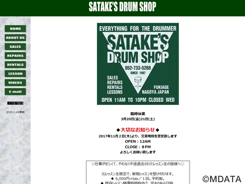 名古屋市千種区の吹上駅からすぐのドラム専門店。ドラムセットからパーカッション、ハードウェア、アクセサリーといった幅広い品揃えで、商品はチューンナップが行われ、最高の状態で提供されている。チューニングやヘッド張替え、シンバルカットなど多岐にわたるリペアや改造、アフターサービスも充実している。また、ドラムスクールも開講していて、コンビネーション、アクセントワーク、リズムワークの三つを軸にレッスンを行う。