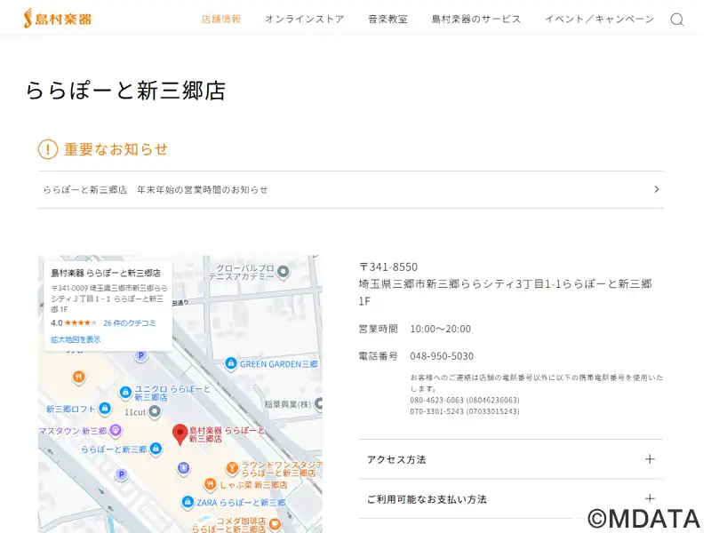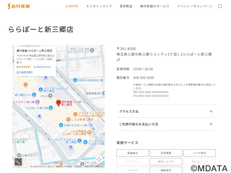 埼玉県三郷市にあるららぽーと新三郷1階に、2017年4月オープンした総合楽器店。アコースティックギター、エレキギター、電子ピアノ、管楽器などの多様な国内外メーカーの楽器から、弦、スティック、リード、メンテナンスグッズ、楽譜などのアクセサリーまで豊富に取り揃える店内には試奏スペースがあり、初心者からプロまでのニーズに応える。音楽教室も併設しドラム、ギター、ピアノ、声楽などの多彩なコースを開講している。