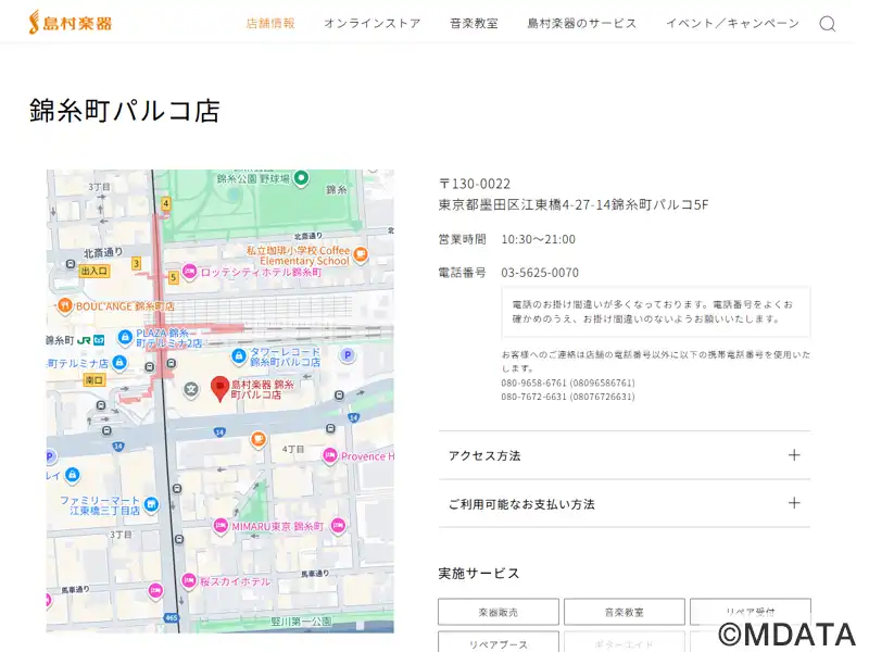 東京・JR錦糸町駅南口から徒歩1分の錦糸町パルコ5階に2019年オープンした総合楽器店。練習スタジオと音楽教室を併設し、店内には電子ピアノ、ギター、ベース、管楽器、アクセサリーなどを揃える。また、クラシック音楽に特化したコーナーや、防音室の展示も行い。音楽教ピアノ、ギター、エレキベース、ウクレレ、ドラムなどの講座を開講。初心者からプロ志望まで対応する。中古楽器の取り扱いや買取サービスも提供している。