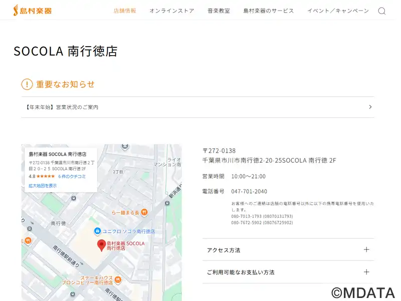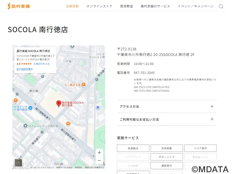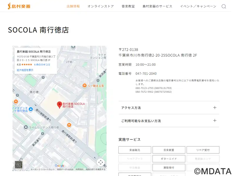 SOCOLA南行徳 2Fに2021年10月29日オープン。ミュージックサロン行徳とミュージックサロン南行徳が統合、新たに「ソコラ南行徳店」としてオープン。楽器や楽譜・教則本、アクセサリーの販売のほか、ギター・ベースの弦交換や修理・メンテナンス、ミュージックスクールではピアノ、管弦楽器、LM系からジャズ系コース、キッズコース、ソルフェージュ、幼児の基礎音楽、ヤマハ音楽教室まで20コースを開講。