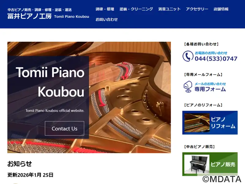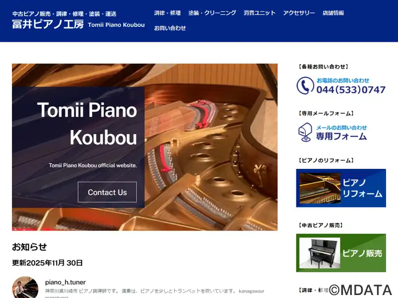 神奈川県川崎市を拠点とする中古ピアノ専門。ヤマハやカワイを中心に、材質や作りに優れた時代のピアノを厳選。自社工房でリニューアルを施して展示販売している。専門知識を持つ技術者が1台ずつ内容を確認し、清掃や修理、塗装、調律などすべての工程を個別対応で実施。木材や部品の状態を見極め、細やかな手仕事で仕上げているのが特徴。アノの運送や消音ユニット工事にも対応。楽器の再生を通じてその魅力を次世代へと受け継ぐ。