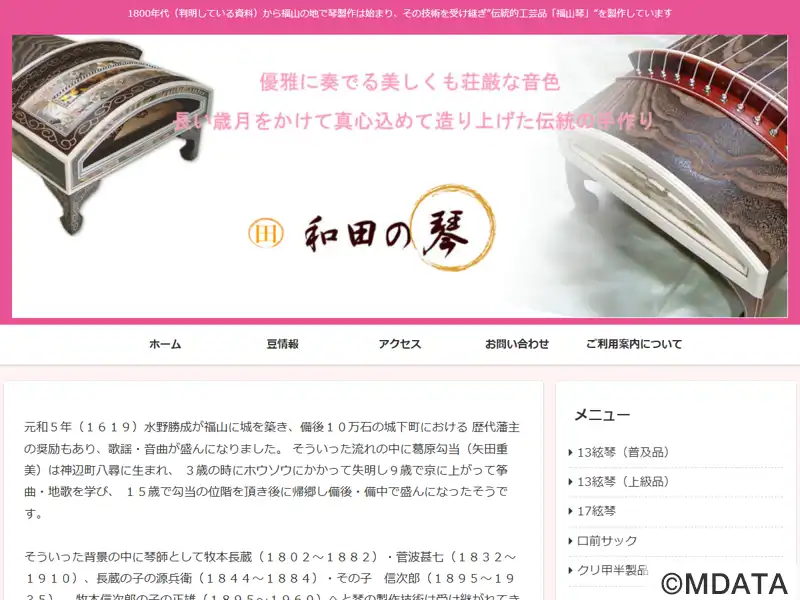琴の名産地の福山にて琴の製造をしています。桐の丸太から2年以上の歳月をかけて伝統の手造りの琴を造りあげています。現在では三代目自身も琴の製作を手がけ、一貫作業の技術を更に身につけながら打ち込んでいます。荒甲(玉縁)・半製品(玉縁)の保有数は数百面以上あり、ご注文に応じてのオーダーメイドもお受けできます。ネットショップでの販売、琴のメンテナンスのご相談も「お問い合わせ」をご利用ください。