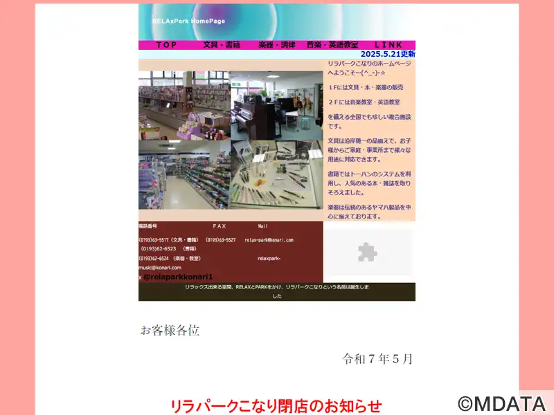 岩手県宮古市にある、文具・本・楽器の販売を行う1階と、音楽教室・英語教室を備えた2階からなるユニークな複合型店舗。ヤマハ特約店として、アップライト・グランドピアノ、電子ピアノ、エレクトーンの販売やピアノ調律にも対応。音楽教室では、オリジナルレッスンのピアノやエレクトーンの個人レッスン、子ども向けの「ヤマハ音楽教室・英語教室」も開講している。施設名は、リラックスとパークを組み合わせて名付けられている。